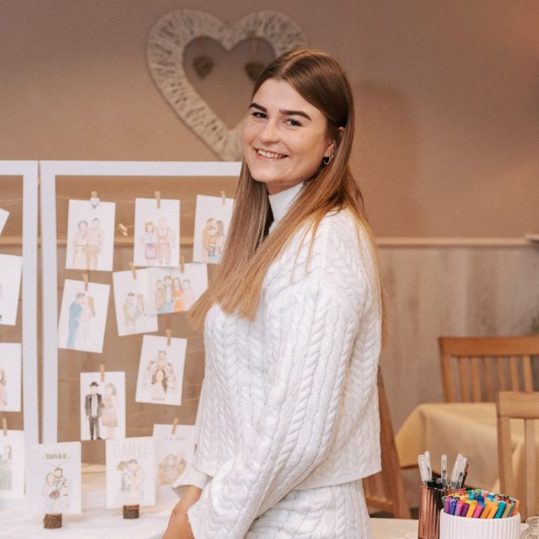 Für mich ist es jedes Mal etwas ganz Besonderes zu erleben, wie sehr sich eure Gäste über ihre Illustrationen freuen. Es bereitet mit große Freude zu sehen, wie eure Gäste an den Bildern stehen bleiben, lachen, sich gegenseitig entdecken und wieder erkennen. Das Lachen, die Überraschung und diese Wärme macht die Live-Malerei für mich so lebendig und persönlich.