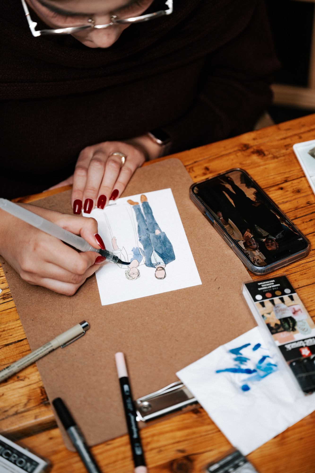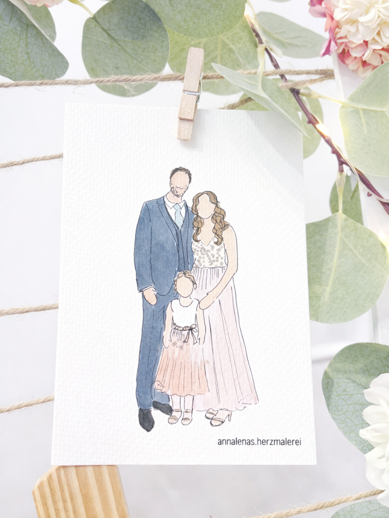 Bei meinen Illustrationen verzichte ich bewusst auf Gesichter. So kann ich in kurzer Zeit möglichst vielen Menschen ein persönliches Bild schenken.